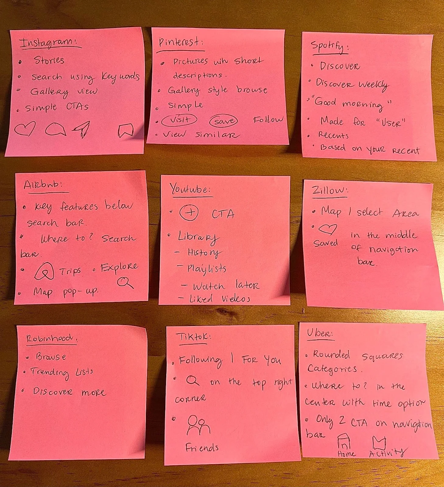 We use these apps on a daily basis, however, we only view them from the perspective of a consumer and not a UX researcher. I spent 2-3 minutes on each app, writing down key ideas and inspirations: